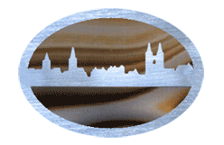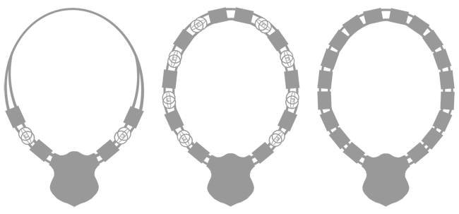 | Kettenglied: geschliffene Stadtsilhouette vor einem Streifachat | Kettenglied: aufwendig zieseliertes Stadtwappen | |||||||