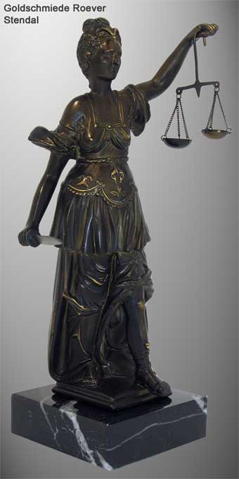 | Figur Justitia 284,00 EUR vollplastische Figur Kopie der 1887 auf dem Frankfurter Römerberg aufgestellten Justitia des Gerechtigkeitsbrunnen feiner Kokillenguss, bronziert auf echtem Marmorsockel; Höhe 29 cm Zur Vergrößerung klicken Sie bitte auf das Bild. |