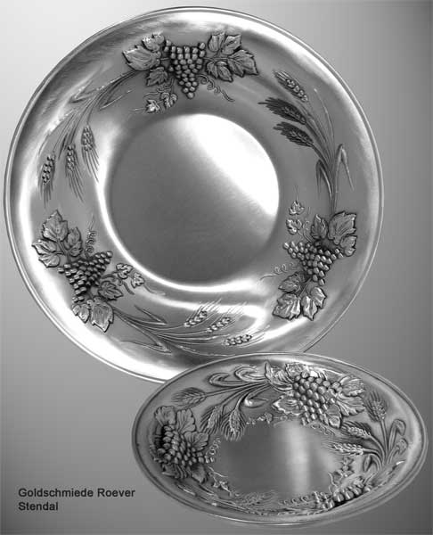 | Zinnschalen "Ernte Dank - Brot und Wein" Ø 30,0 cm 79,80 EUR aus echtem Zinn gegossen, lebensmittelecht Zur Vergrößerung klicken Sie bitte auf das Bild. |
